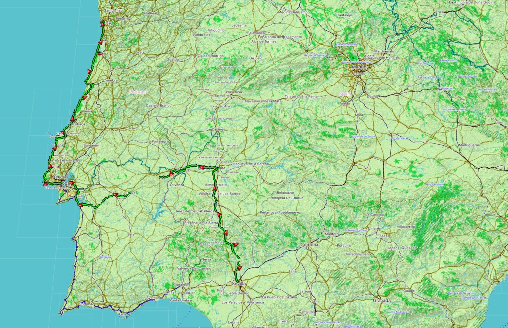 In oktober 2017 zijn we van Sevilla in Andalusië naar Porto in Noord-Portugal gefietst, ruim 1000 km. Vanaf Sevilla tot Mérida volgden we de Zilverroute langs de Spaans-Portugese grens van Paul Benjaminse. Het stuk van Mérida tot Lissabon stond in de Ruta Iberica, ook van Benjaminse. Vanaf Lissabon naar het noorden was lastiger. We wilden niet door het binnenland fietsen in verband met de bosbranden die Portugal in het voor- en najaar van 2017 geteisterd hebben. Een kustroute is nog niet beschreven. Er bestaat wel een route, de Eurovelo1, onderdeel van de Atlantic Cost Route, maar die is nog in ontwikkeling en grote delen ervan zijn eigenlijk alleen geschikt voor mountainbikers. Voor reisfietsen is deze route deels goed te doen, maar deels ook helemaal niet (zandstranden, trappen, steile onverharde paden). Bovendien ontbreken er stukken. We hebben van Lissabon tot Porto de R1 zoveel mogelijk gevolgd en waar dat niet ging met behulp van OpenStreetMap naar alternatieven gezocht.
