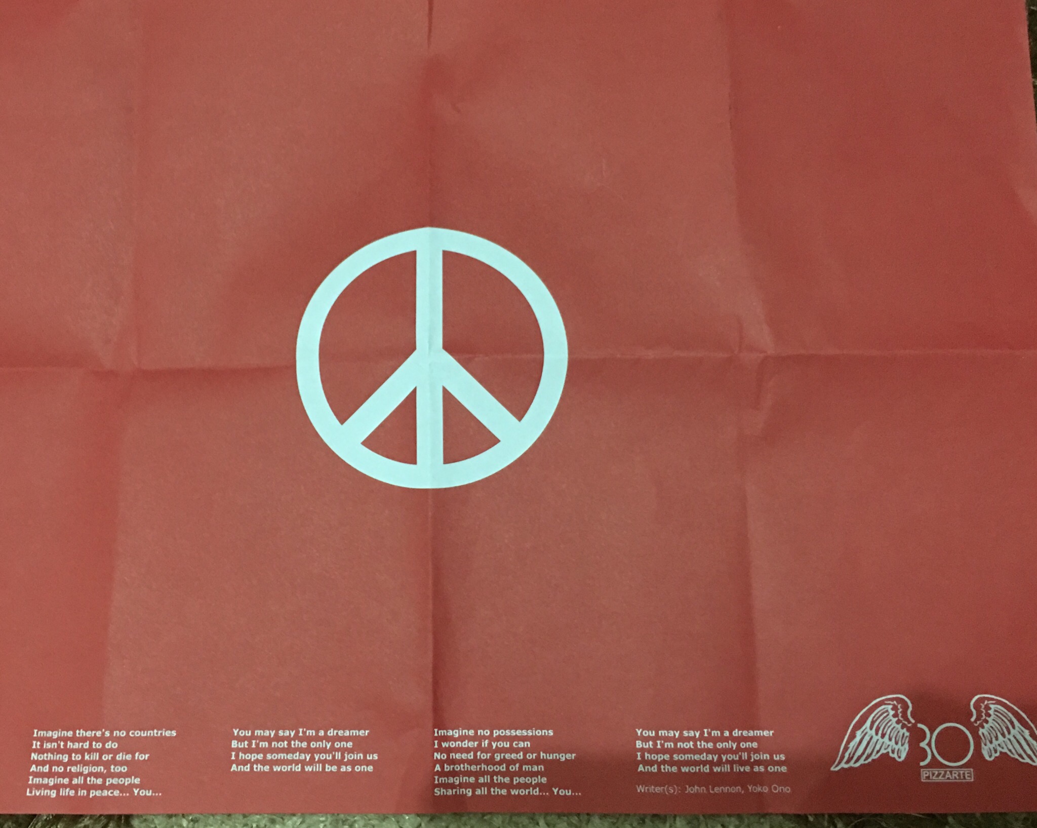 Lezen. En eten in een leuke pizzeria met placemats waarop de tekst van Imagine van John Lennon.