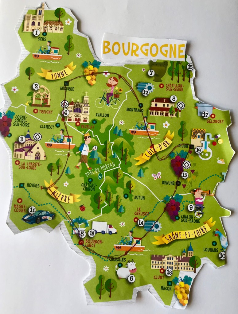 We fietsen de ronde met het boekje Le Tour de Bourgogne à vélo van Michel Bonduelle. “Par les voies vertes” staat erbij. En dat klopt ook: de route is bijna helemaal autovrij. Er is ook een website van deze tour.