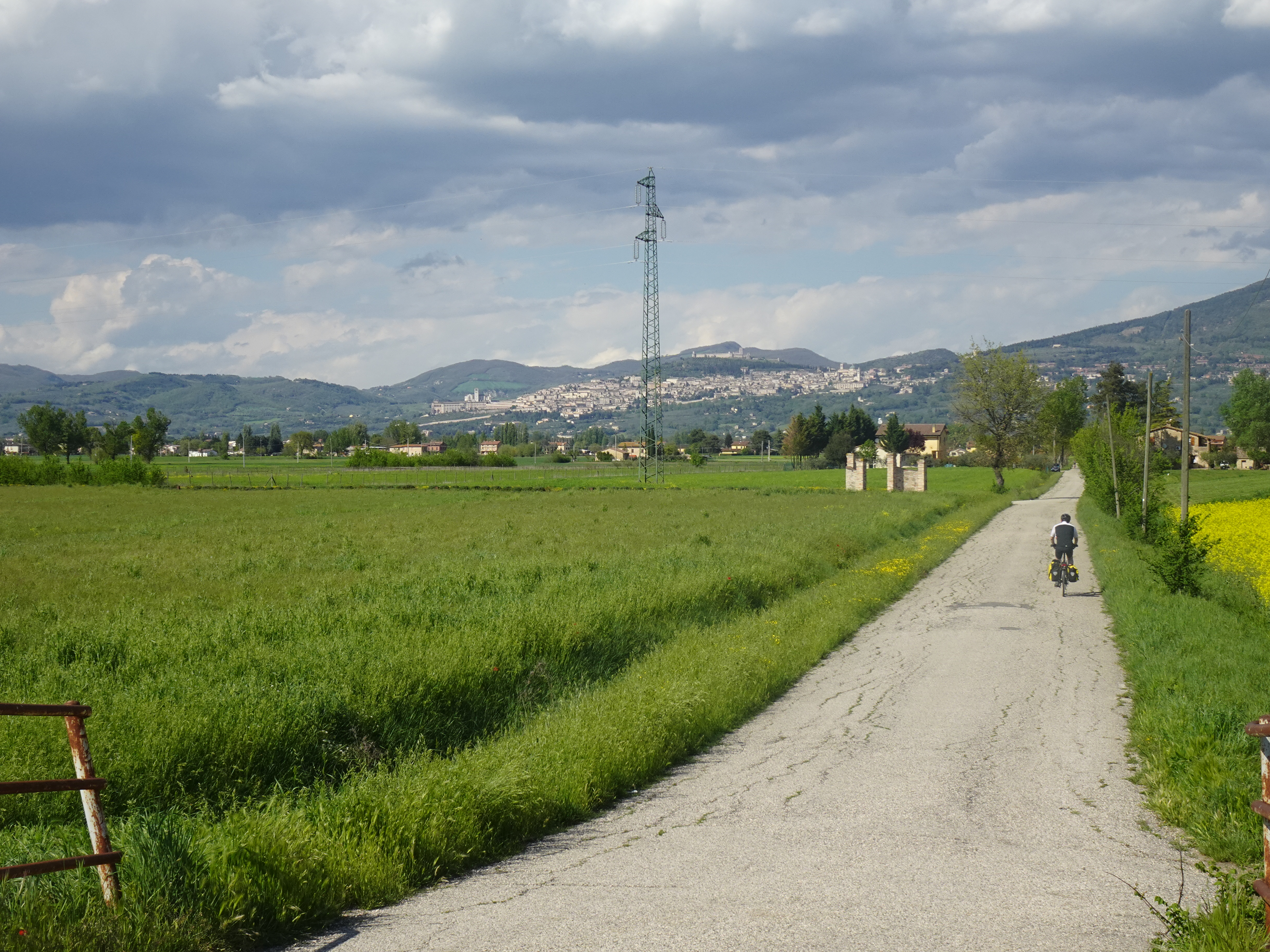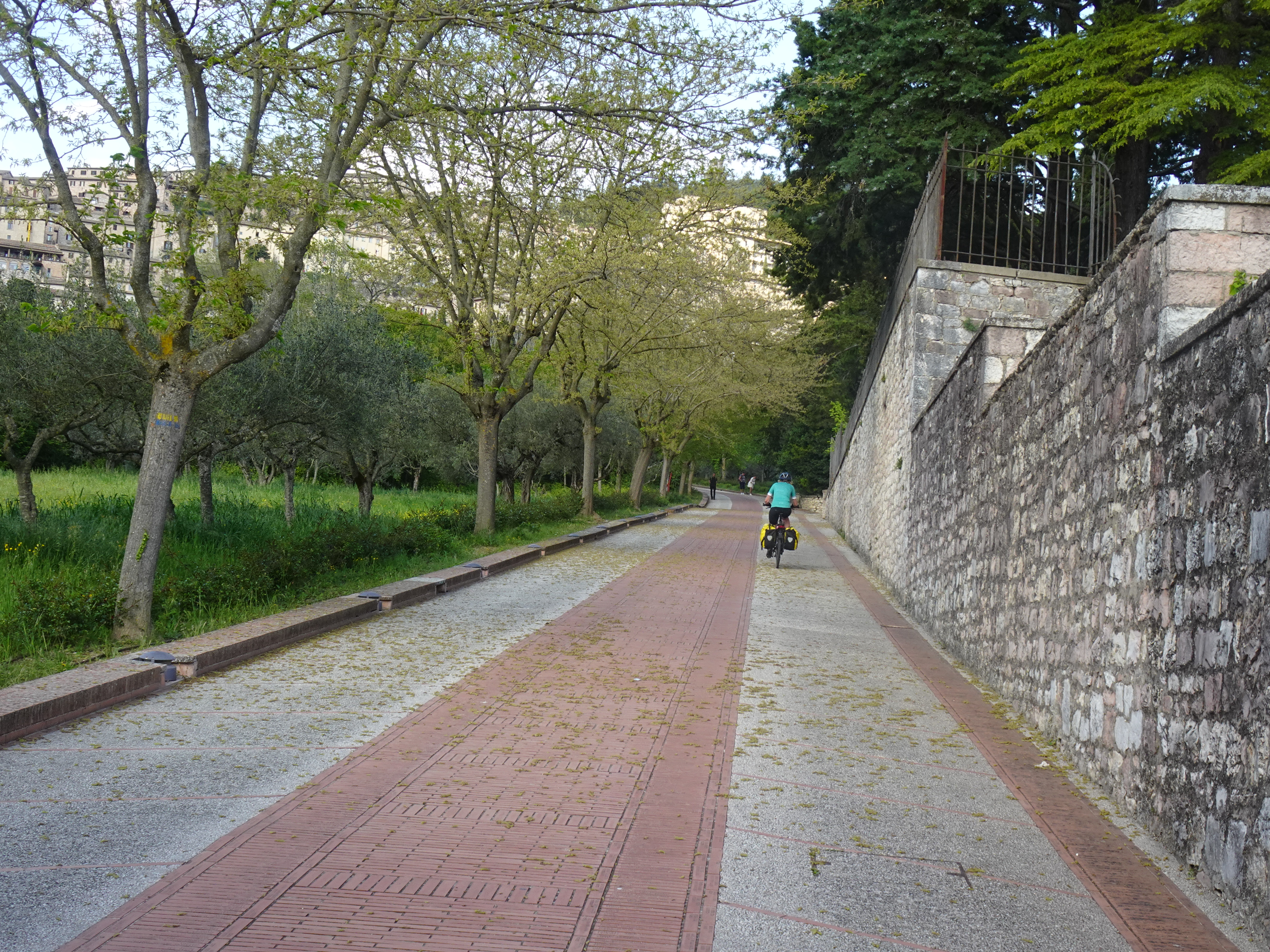 Al kilometers voor we er zijn duikt in de verte Assisi op, tegen de flanken van de Monte Subasio. Er loopt een fietspad heen. Dat begint wat moeizaam, losse troep , zand en gruis en scheuren in de verharde gedeelten. Later wordt het beter. Het fietspad blijft vlak tot onder de San Francesco om dan steil omhoog te gaan over de Strada Mattonata, de oude pelgrimsweg rechtstreeks naar de basiliek. Die weg is sinds 2000 voorzien van duizenden klinkers met namen. De weg is verlaten op een paar wandelende mensen na.