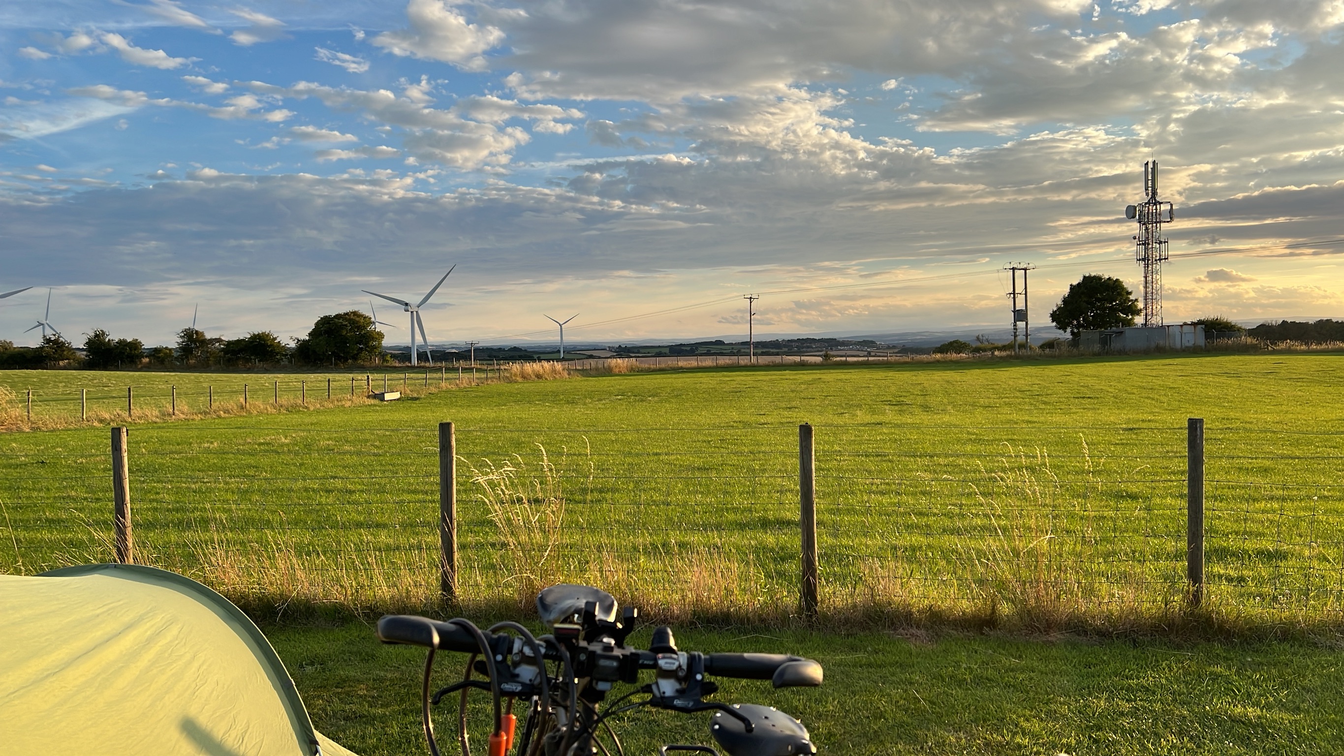 Het is er erg druk. Zaterdagmiddag betekent hier dat er al heel veel gedronken is. Luidruchtige mannen en extreem vrolijke vrouwen. Niet onze sfeer. We drinken een cola en gaan snel verder. Volgens het routeboekje moet er zo’n 15 km verderop een boerderijcamping zijn. Dat is ook zo, een boerderij hoog boven het dorpje Haswell. Vanaf de Colliery farm campiste heb je prachtig uitzicht over de hele streek. Of we hier onze tent mogen neerzetten voor de nacht? Does n’t look overcrowded does it? zegt de boer. Er staan inderdaad maar drie caravans. Bij één ervan kan ik de Garmin opladen. We eten op wat we nog bij ons hebben en gaan vroeg slapen.