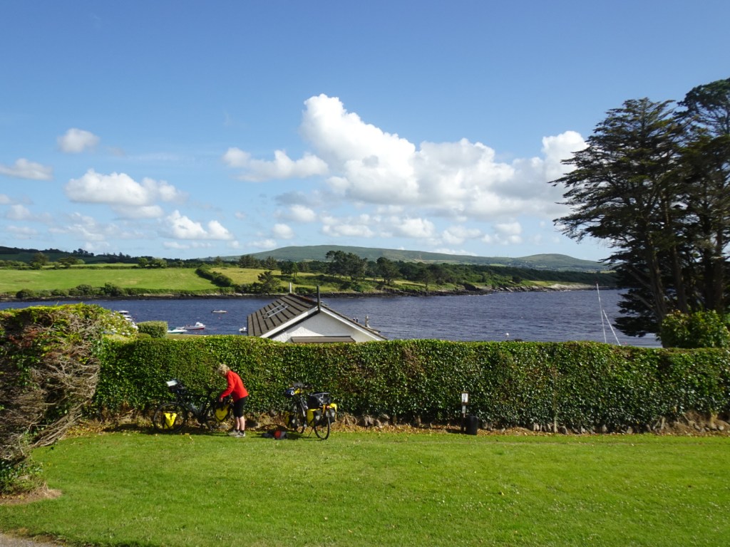 Op Camping Eagle Point kunnen we kiezen voor een prachtige plek op de punt met uitzicht over Bantry Bay, maar daar zijn gisteren een paar tenten weggewaaid, of voor een saaie, beschutte plek achter een heg. We kiezen voor het laatste.