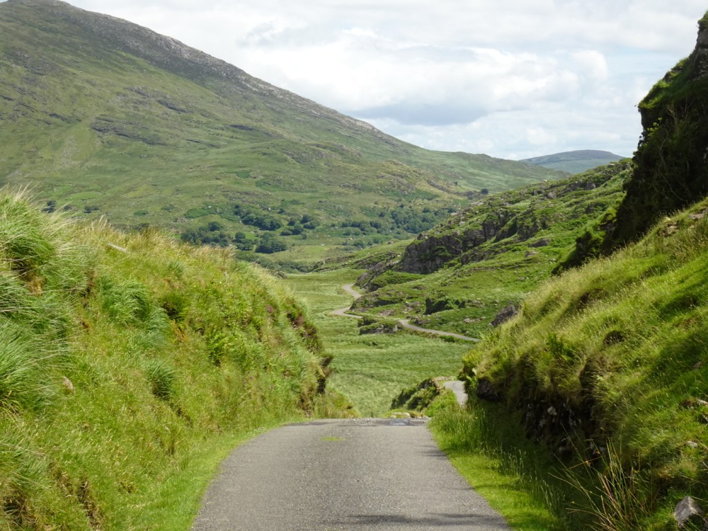 De Ballaghbeama-pas kent een lange aanloop, in de verte verdwijnt de weg min of meer de lucht in, langs steile rotsformaties. Als we dichterbij komen blijkt met name het laatste stuk van de pas net zo moeilijk als het eruit ziet. Gemiddeld 12 procent zegt het boekje. In de praktijk een afwisseling van vlak en echt heel steil. We moeten verschillende keren afstappen en ik begin aan mezelf te twijfelen. Maar we halen de top.