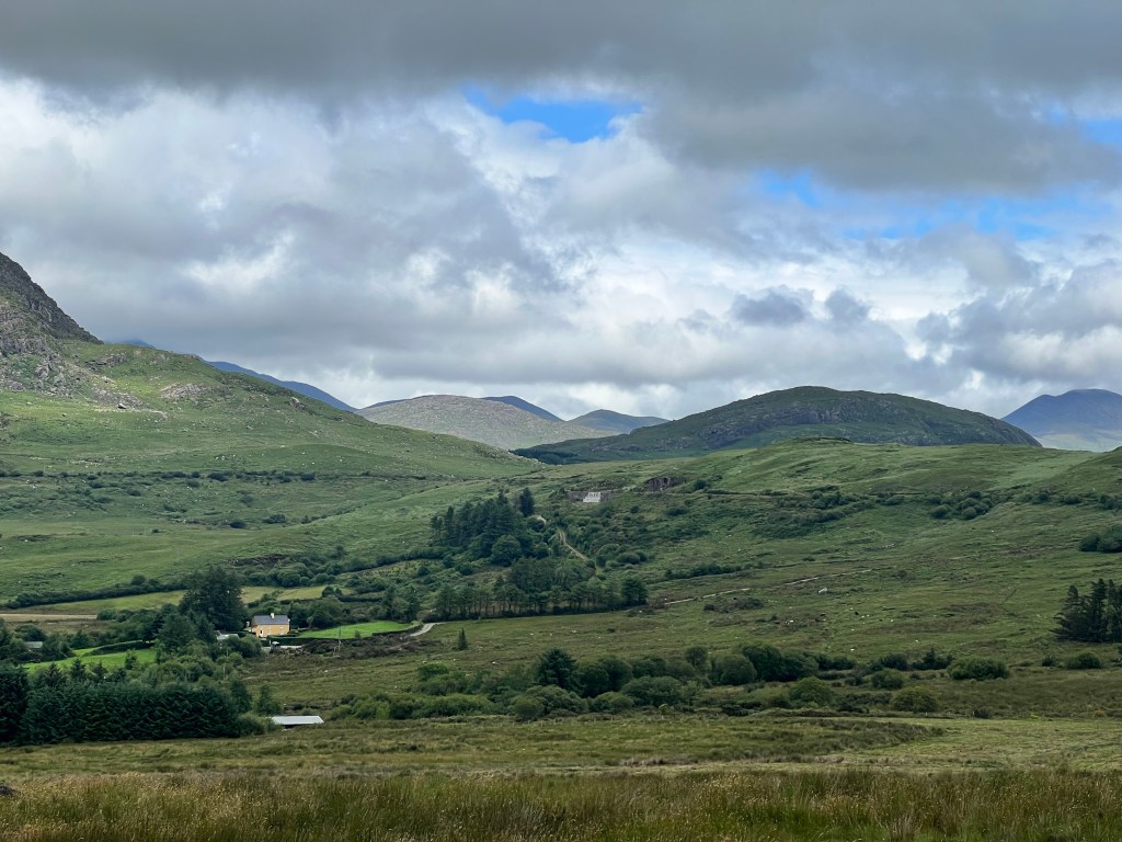 In Kenmare kopen we op het marktje sodabread, gebakken met Guinness, en dan op pad. Eerst langs de noordkust van de Kenmare Bay. Dan een slingerende weg omhoog. Niet moeilijk. Naarmate we hoger komen wordt het landschap woester en krijgen we een mooi uitzicht over de bay. De bergen waar we overheen moeten komen dichterbij.