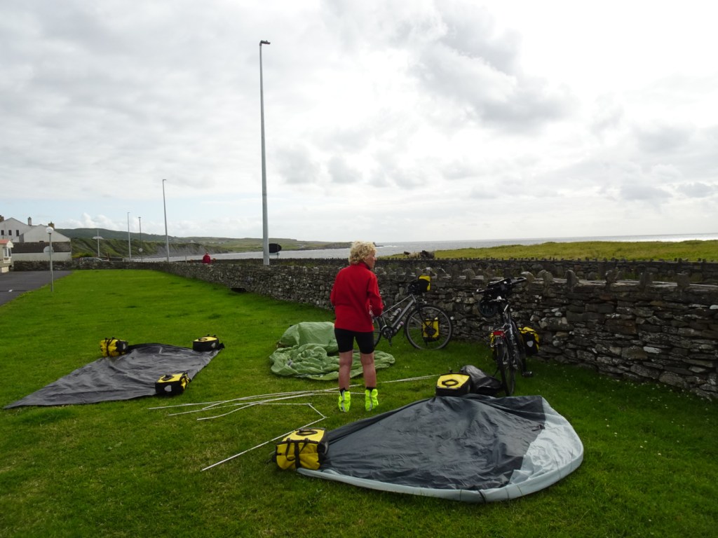 Op de camping van Lahinch, boven de oceaankust, is er één grasstrook voor tentjes. Die ligt langs het oude muurtje van stapelstenen dat de camping scheidt van de kustweg. We zetten de tent zo dicht mogelijk tegen het muurtje. Dat breekt misschien de wind een beetje. Die wind jaagt aan één stuk door vanaf de Wild Atlantic over ons heen.