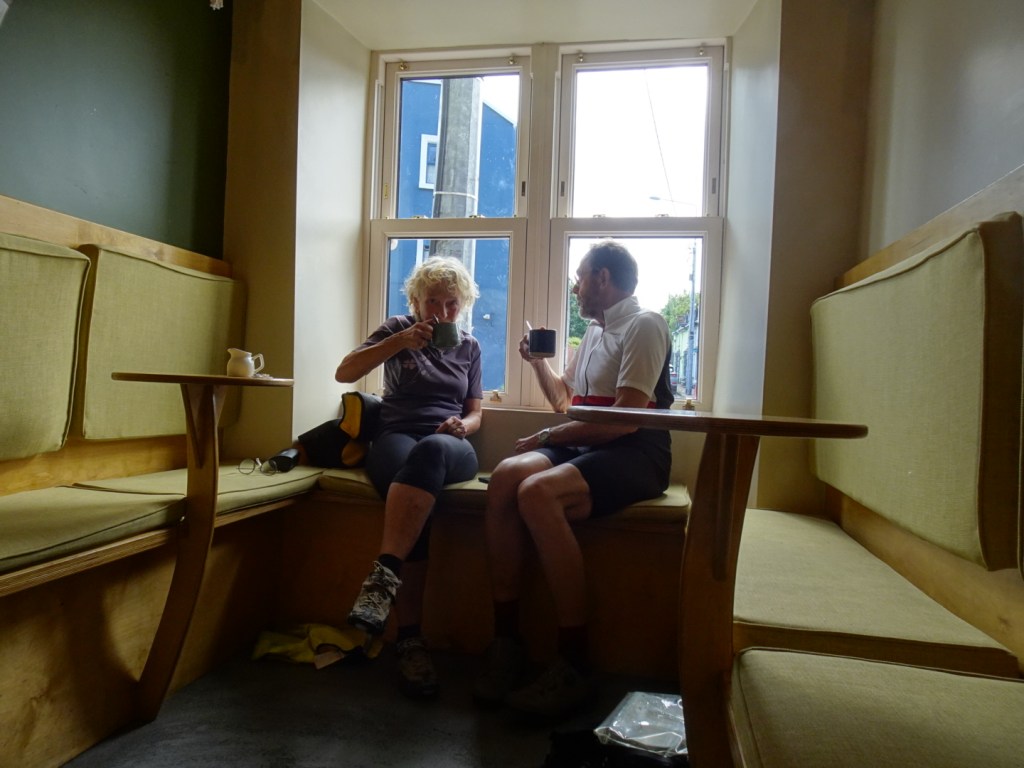 Heel ongerept; kaal en stenig, met toch allerlei planten, kruiden en struiken die een plekje tussen de stenen veroverd hebben. Kale bergen rondom. Als we lager komen af en toe een boerderijtje; nog lager leuk opgeknapte oude huizen en tenslotte weer de bekende smakeloze landhuizen. Kort vóór het eerste dorp, Kinvarna, overvalt ons een felle bui. We schuilen tussen twee hokken bij een sportveld. In een koffiecafé proberen we een beetje op te drogen. Lekker hier.