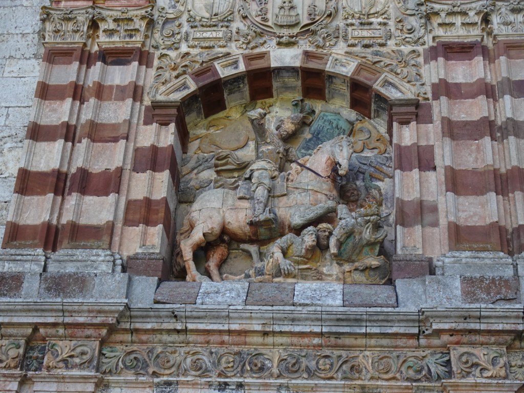 Boven de hoofdingang is El Cid afgebeeld als Santiago Matamoros, Jacobus de Morendoder. Volgens de Spaanse nationale mythe was de verovering van Al Andalus door ‘de christenen’ een eeuwen durende kruistocht, die begonnen zou zijn met een veldslag midden negende eeuw waarbij het leger van Asturië aangevoerd werd door de heilige apostel Jacobus zélf.