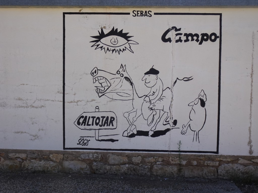 en met de wind in de rug naar het volgende dorp, Caltojar, waar we plotseling bekende kunst zien: Picasso! De street art kunstenaar Sebas uit Burgos, intussen wereldberoemd, heeft hier over wel honderd meter een hommage aan de grote meester op de muren gezet. Dit maakt het voor ons weer bijna goed dat de Picasso-afdeling in Guggenheim Bilbao gesloten was!