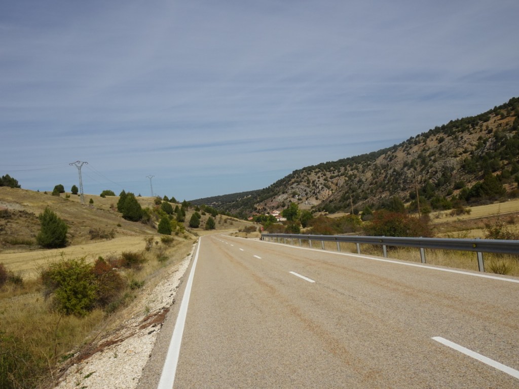 Het vervolg van de route is uitgesproken saai: een brede weg. Maar met wel twee keer een klim van 3,5 km 7 procent gemiddeld. De vrachtwagenchauffeur had gelijk. Maar we komen beide keren soepel boven. Alleen de afdalingen zijn wat lastiger door het slechte wegdek met brede scheuren.
