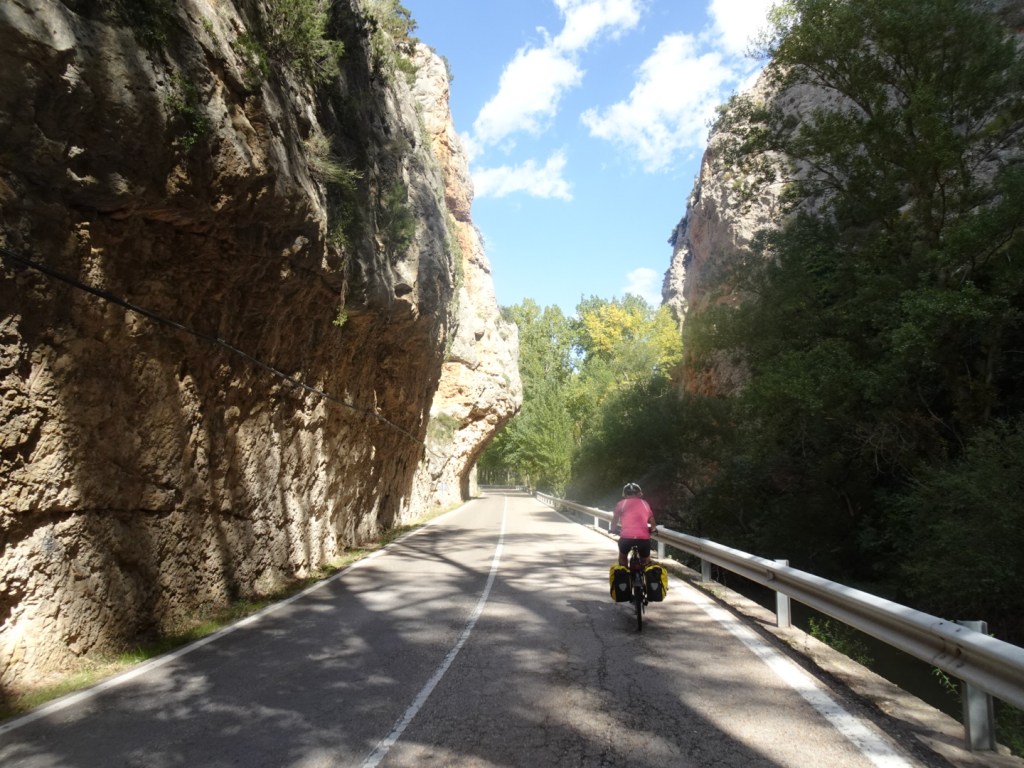 Beneden komen we op bekend terrein: dit traject hebben we in 2016 in omgekeerde richting gefietst, van Albarracin naar Cuenca. Na het laatste stuk, door een imposante kloof, duikt Albarracin op.