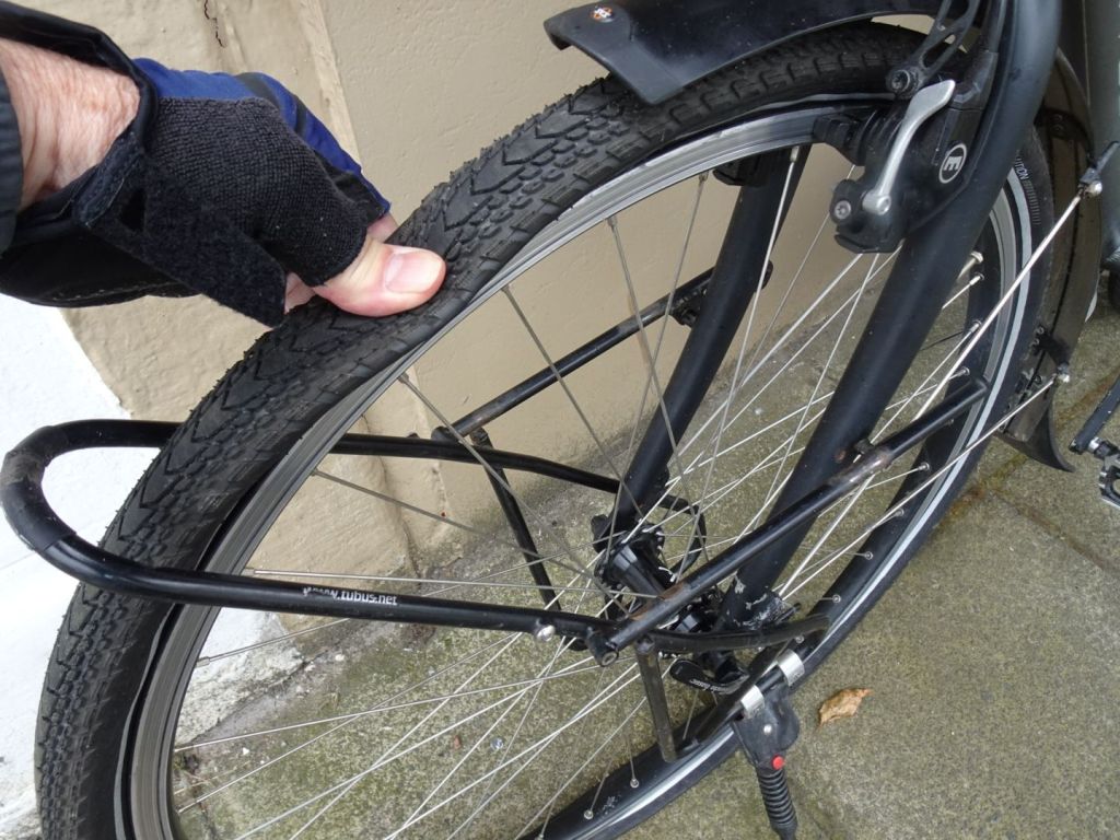 Plakken lukt niet. De fietsenmaker, die is er in dit plaatsje, constateert dat er een nieuwe binnenband in moet. Dat fikst hij wel voor ons, we kunnen het rustig afwachten in het café om de hoek. Daar is het droog en warm en er zitten meer fietsers. Ook om te schuilen, want het is inmiddels hard gaan regenen.