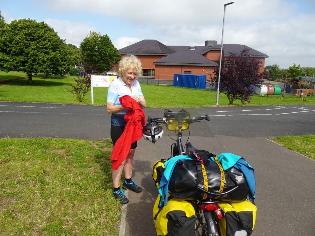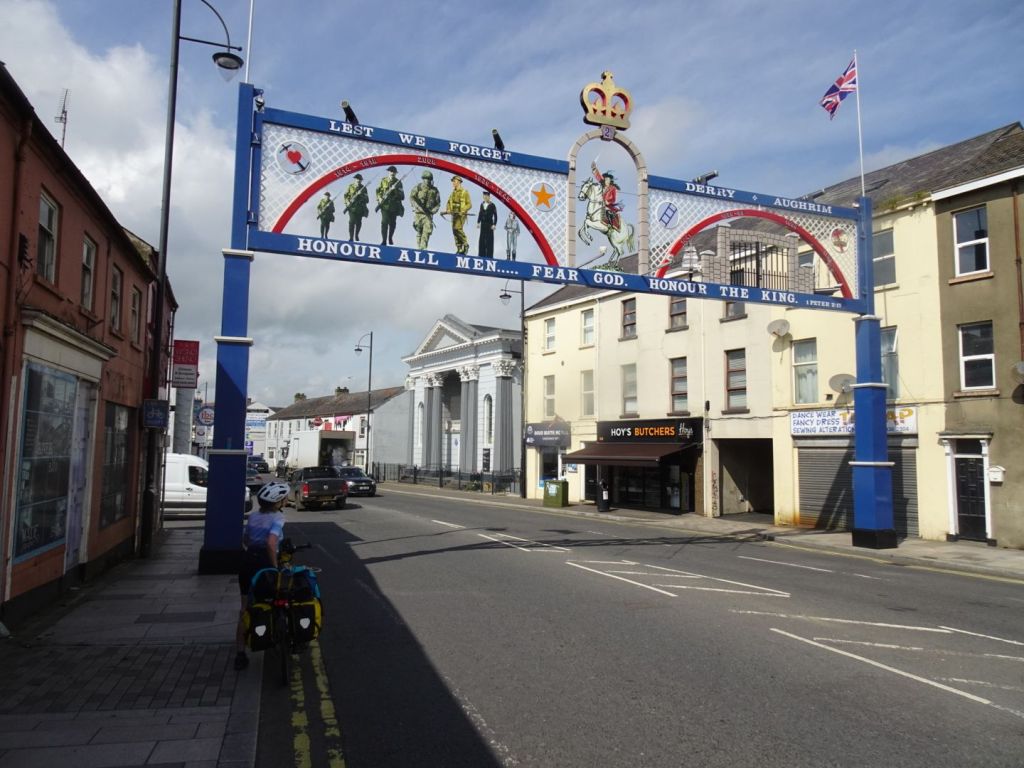 Het is heerlijk weer en de fleece kan al snel uit. We fietsen met een grote boog om het meer door het stedelijke gebied rond Portadown. Overal veel Union Jacks, militaristische triomfbogen en ander loyalistisch vlagvertoon.