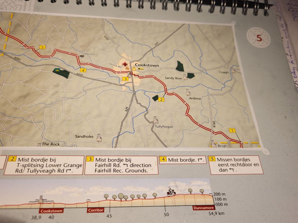 De laatste klim, niet ver voor Omagh, gaat over een drukke verkeersweg. Bijna elke automobilist is erg voorzichtig maar vaak kunnen ze de snelheid van fietsers niet goed inschatten. Als we (langzaam) klimmen blijven ze lang achter ons hangen terwijl ze allang hadden kunnen inhalen; als we (snel) dalen halen ze wel in maar kunnen ze soms maar net voor hun tegenligger naar links duiken.