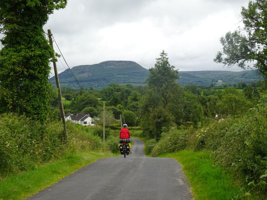 In de verte zien we het indrukwekkende profiel van de Benaughlin mountain. We fietsen er omheen.
