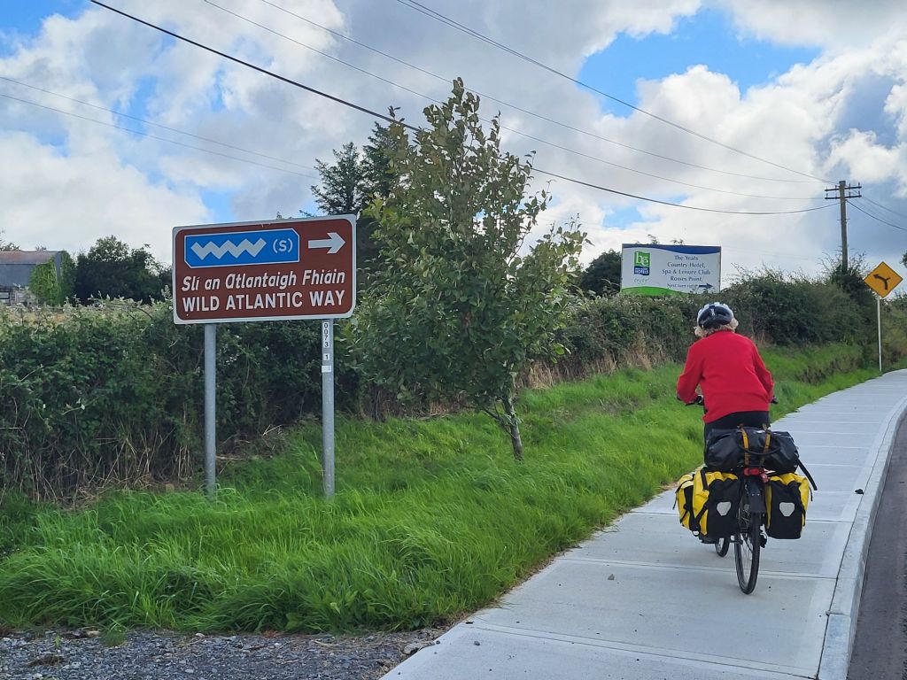 En dan zien we het eerste bord van de Wild Atlantic Way. Daar hebben we bijzondere herinneringen aan. Vorig jaar hebben we hem vanuit het zuiden lange tijd gevolgd. Bij Lahinch zijn we toen finaal van de camping geblazen.