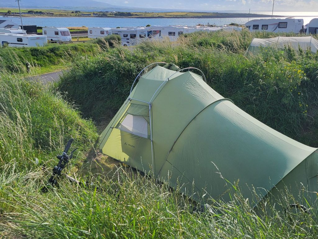 Nu is het weer zo vriendelijk dat we besloten hebben te kamperen: aan Sligo Bay, op de camping Rosses Point. Mooi plekje voor de tent, heel beschut deze keer.
