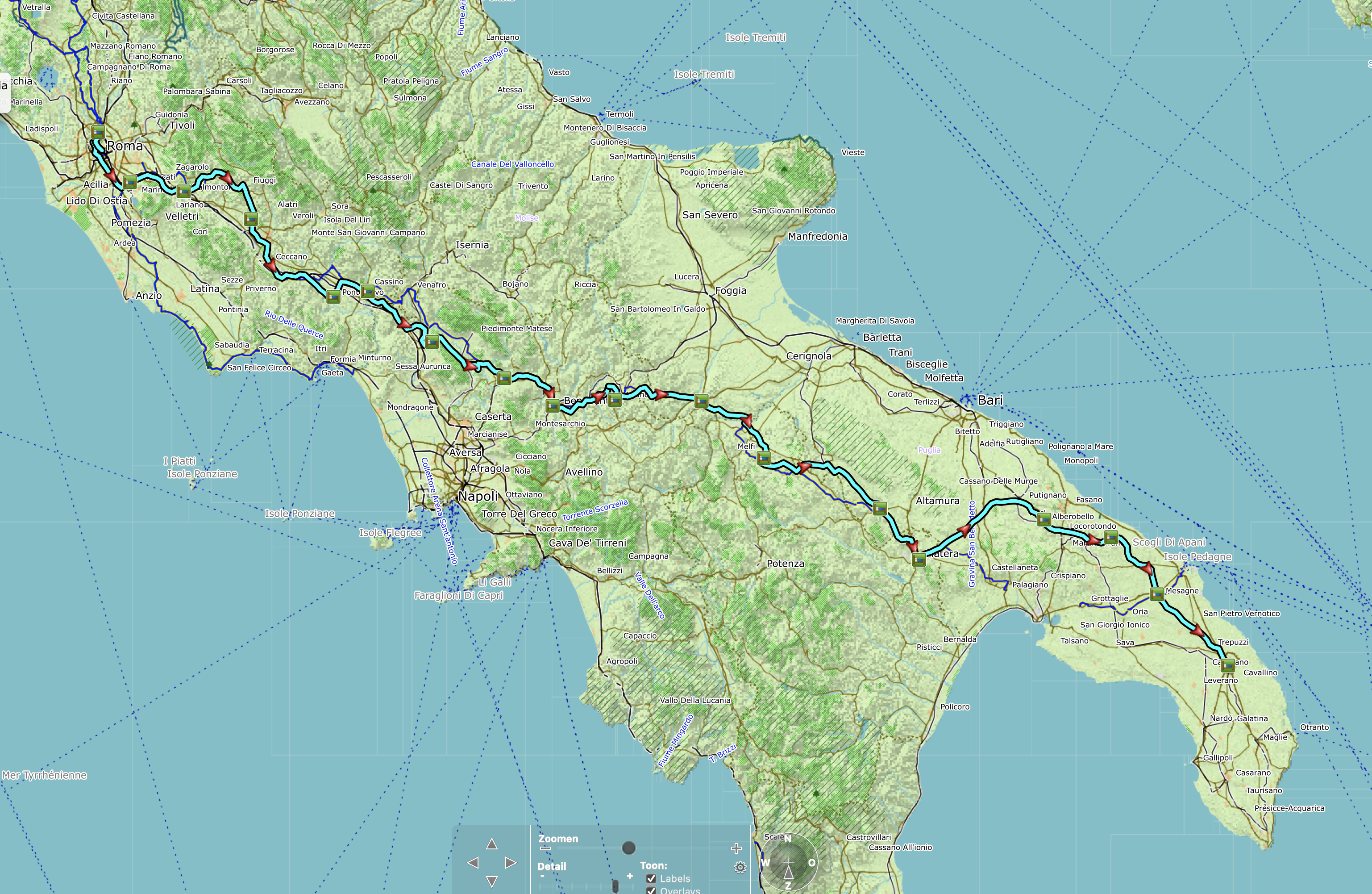 We hebben een route gevolgd van Hans Reitsma waar nog geen boekje van verschenen is, maar al wel beschrijvingen van bestaan in de vorm van een pdf en gps-tracks. Omdat we vermoedden dat het een redelijk zware route zou worden (we rijden nog steeds niet elektrisch) en er in het binnenland van Italië weinig campings zijn, hebben we de tent niet meegenomen. Daar zware viel wel mee. Je steekt de Apenijnen vrij zuidelijk op een laag punt over. Toch vonden we het in Lecce welletjes. Een prachtige tocht, maar toen wilden we wel weer naar huis.