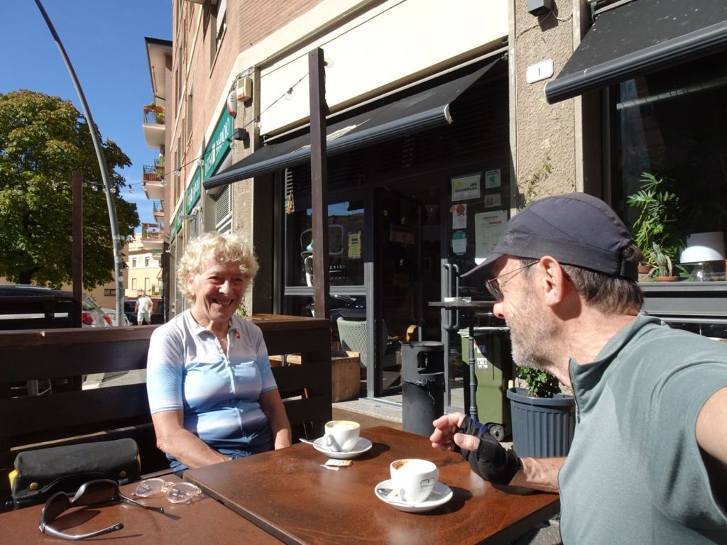 Vooralsnog is het zonnig en warm. We klimmen langs een drukke weg naar Frascati. Daar drinken we koffie en kopen kaas, brood en water voor de lunch.