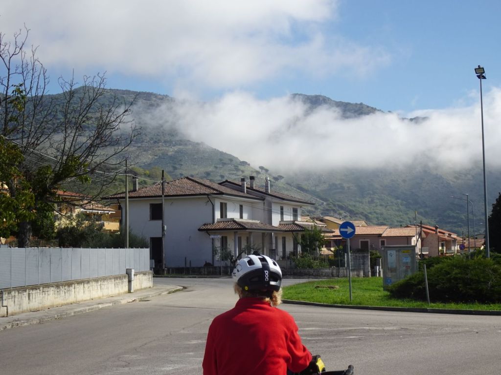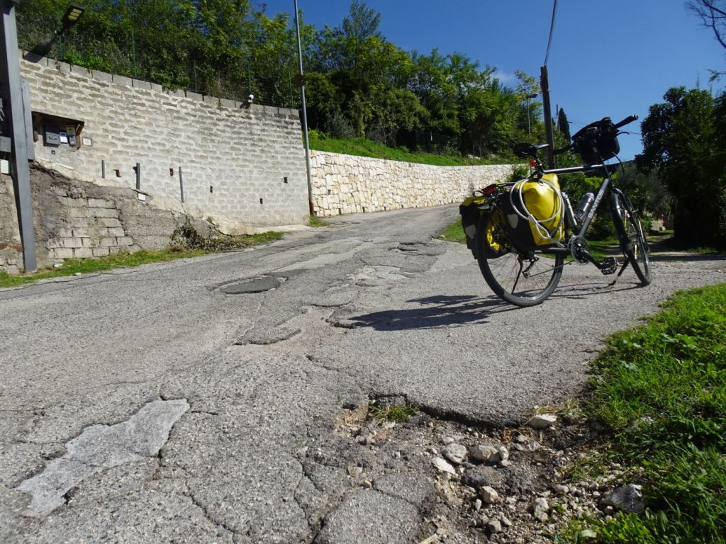 Over een ‘Cicli Pista’ (ze zeggen het hier wat korter) naar Cassino. De Cicli Pista della Memoria en dat laatste verwijst ongetwijfeld naar de slag bij Monte Cassino. Maar het wegdek is zó slecht dat het soms wel recent gebombardeerd lijkt. Ook memorabel.