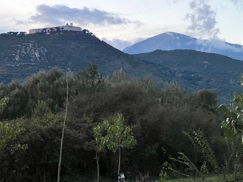 Er is hier ook een wasmachine dus we krijgen alles schoon. En droog, het regent de hele dag niet. ’s Avonds zien we het klooster van Monte Cassino afsteken tegen de donkerende lucht. We hoefden vandaag gelukkig niet omhoog te fietsen: mijn Poolse plicht heb ik in 2005 al vervuld.