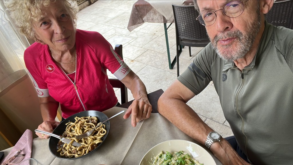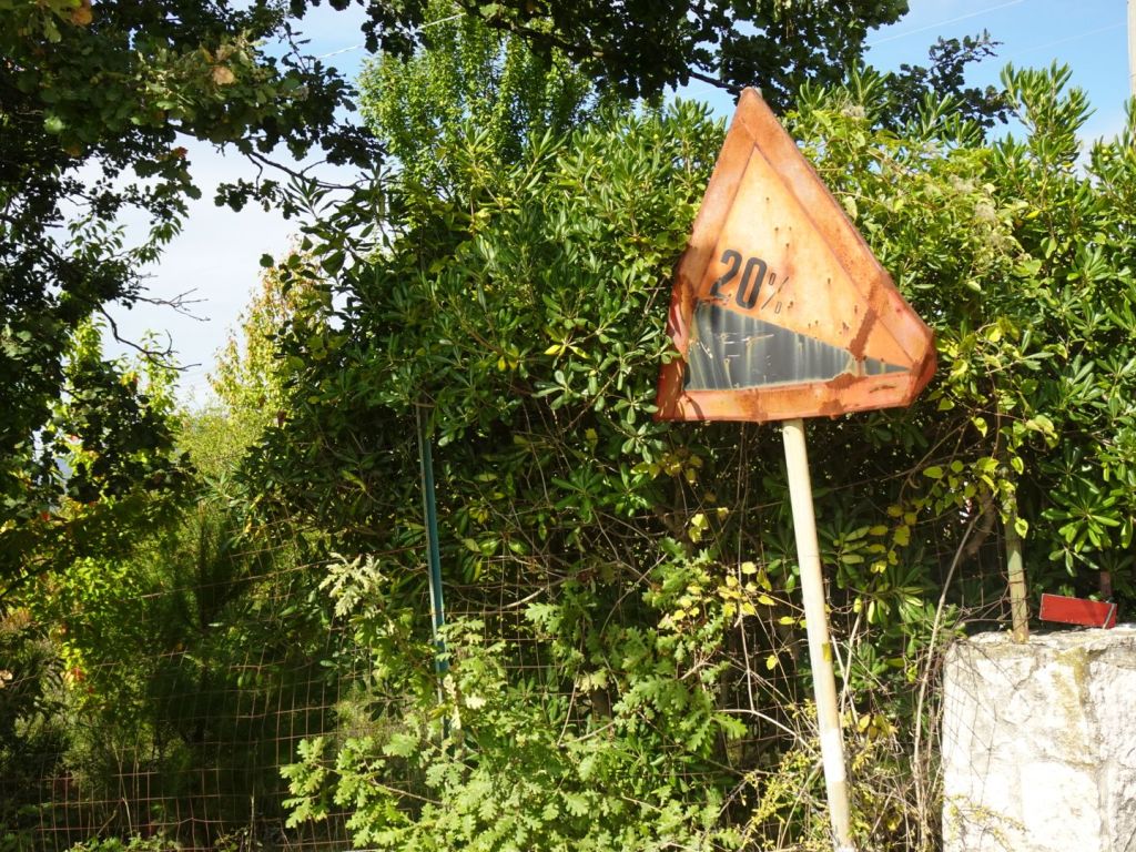 Als we na het eten weer verder fietsen volgt meteen een helling van 20%. Dat is niet goed voor de spijsvertering.