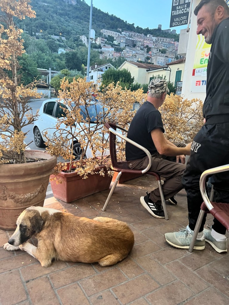 De koffie bij het ontbijt in de agriturismo was koud en slecht. Wij snakken naar goede koffie. Op maandagochtend zijn er weinig bars open. Maar om 12 uur, bij het binnenrijden van Mignano zien we er één. De cappuccino is heerlijk. In de kern van hetzelfde plaatsje stuiten we even verder op een osteria die er ook aanlokkelijk uitziet. Dan maar gelijk lunchen!
