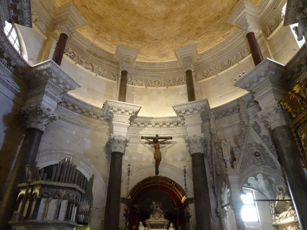 Dit stadsdeel heeft nog de duidelijk herkenbare vorm van een Romeins castrum. Keizer Diocletianus, zelf Dalmatiër van geboorte, liet hierin een paleis bouwen waar hij na zijn aftreden ging wonen (dat was uniek, een keizer die met pensioen ging). Er zijn nog veel resten van te zien. De mooie Domniuskerk is in feite het mausoleum van de keizer. Van de sfinxen die hij uit Egypte liet overbrengen zijn er nog twee. Het peristylium van het paleis (zeg maar: de binnentuin) is nu een klein plein waar zich massa’s toeristen verzamelen. Van de grote voorraadkelders is veel behouden; nu zijn ze vooral bekend als de ‘Dragon’s Lair’ uit de serie Game of Thrones. Die is trouwens alomtegenwoordig in Split: je kunt hier deelnemen aan rondleidingen waarbij alle gebruikte locaties bezocht worden.