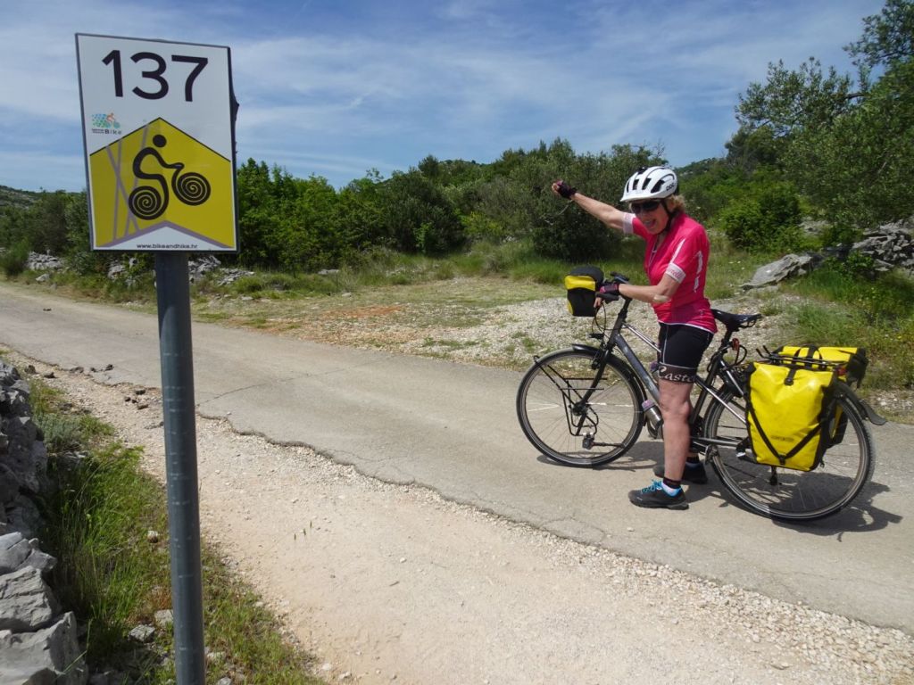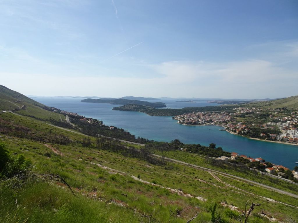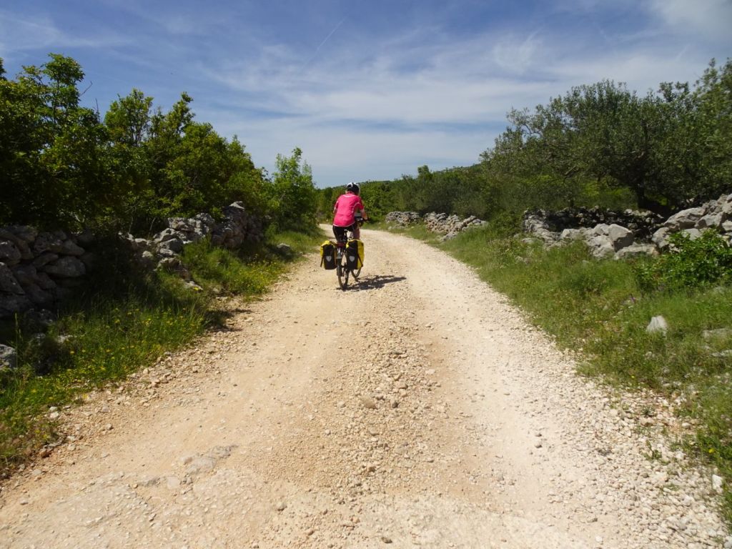 Even hoopten we nog dat we vanaf Trogir een klein kustweggetje konden volgen in plaats van de drukke verkeersweg naar Šibenik. Maar dat kustweggetje is niet te vinden dus we wagen ons tussen het verkeer. Als Rienke opzij moet duiken voor een achteropkomende bus die weigert snelheid te minderen tot hij in kan halen, zijn we gelukkig bijna op het punt dat we volgens planning deze rotweg kunnen verlaten. We gaan de EV8 (EV=EuroVelo) volgen, het binnenland in tot we in Grebaštica weer op de kustweg komen.