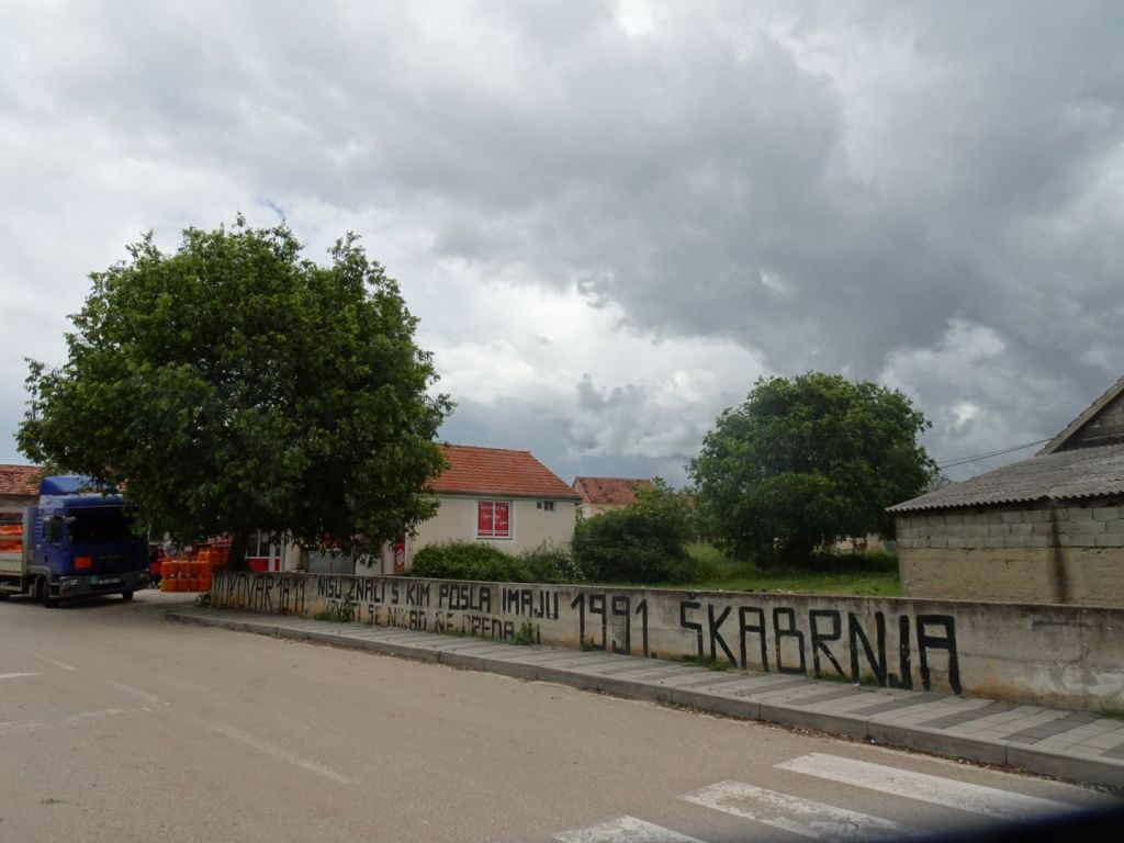 Een infobord vertelt dat de Četniks van de Servische separatisten hier samen met het „Joegoslavische” (=Servische) leger in 1991 het hele dorp hebben verwoest en 64 mensen hebben vermoord. Škabrnja ligt aan een belangrijke toegangsweg naar Zadar. Pas nadat Milosovic het in 1995 op een akkoordje gooide met Tudjman en z’n handen van de strijd om Zadar aftrok, heroverden de Kroaten het dorp en konden de Kroatische inwoners terugkeren.