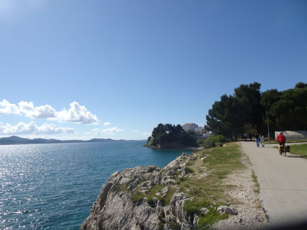 De laatste 25 km zijn bergaf naar zee en een mooi stuk langs de kust. Dan door de stadspoort de oude stad in. Morgen blijven we in Zadar om de Romeinse en Venetiaanse overblijfselen in deze stad op ons gemak te bekijken.