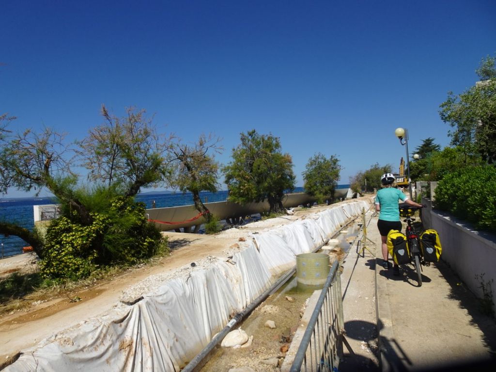 De eerste kilometers buiten de stad vlotten ook niet zo: opengebroken wegen, mooi maar lastig gravelpad langs de kust naar Zaton (of Zadom, dat staat er op een muur).