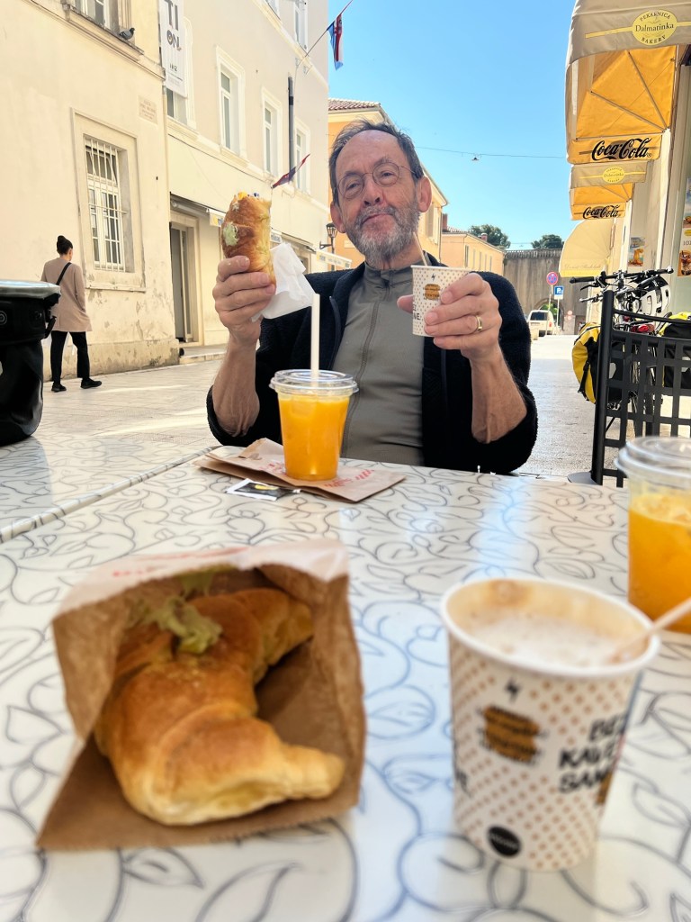 Als we de tassen alle trappen van het appartement af gesjouwd hebben blijkt dat mijn toilettas nog boven staat. Even later mist Rienke haar bidons: nog boven. Dan nog koffie, pistache-croissant en vers sinasappelsap als ontbijt.