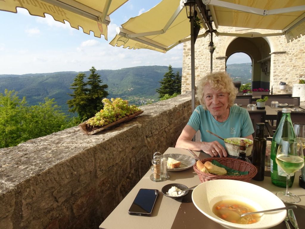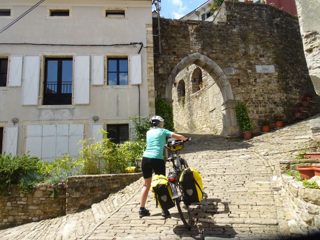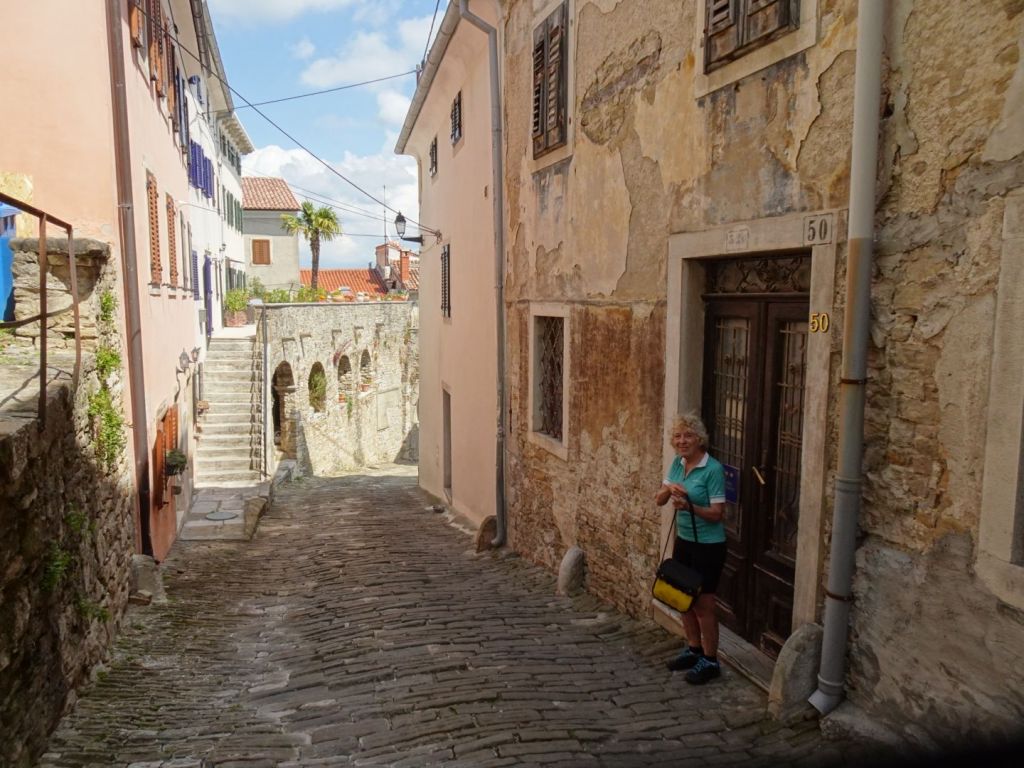 We hebben nog een groot deel van de middag om ons daar te installeren in een apartman en de steile straatjes te verkennen. Dat doen we samen met veel fietsers, de meeste elektrisch en Duits, die bovendien hun bagage laten vervoeren: een georganiseerde fietsreis. Motovun, ook alweer eeuwenlang een Venetiaans steunpunt, is een toeristenstadje maar beslist de moeite (= voor ons: de klim) waard. Als we zitten te eten zien we in het westen achter de laatste heuvels een zilveren streep: de zee!