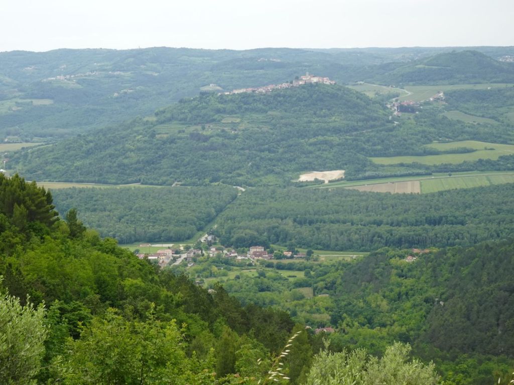 De klim is niet heel steil, maar duurt wel lang. Acht haarspeldbochten met flinke stukken rechte klim ertussen. Eenmaal boven worden we beloond met een mooie terugblik op Movotun. Wat is dit deel van Istrië toch prachtig!