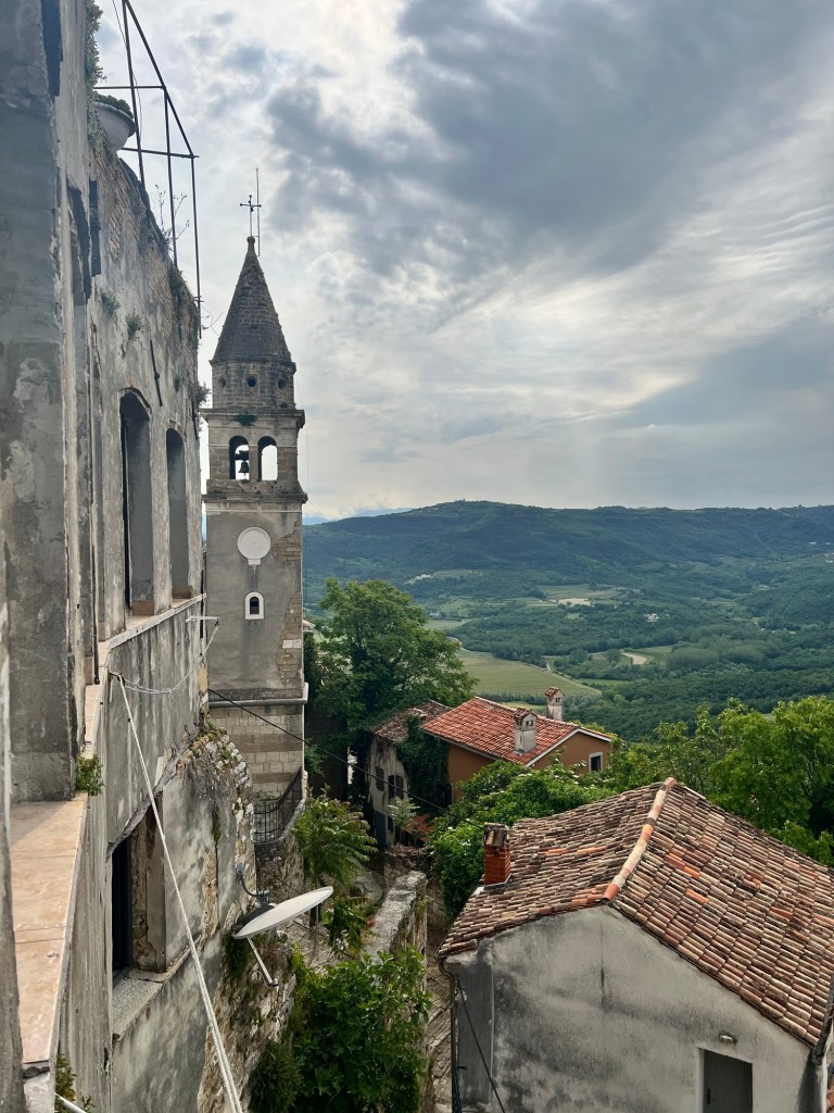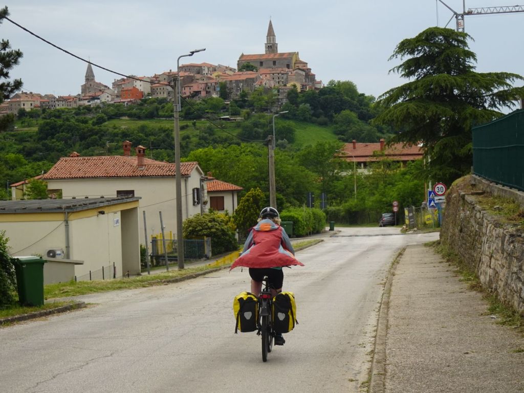 Het plaatsje Oprtalj op de top wordt helemaal opgeknapt, waarschijnlijk voor het toerisme. We eten er een klein pizzaatje en wachten een eerste bui af.