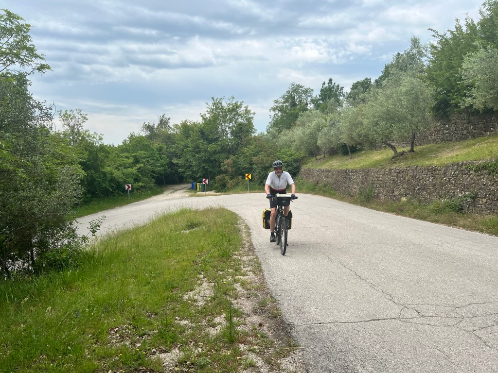 Na een eigen ontbijtje sjezen we de berg af en verder naar beneden naar Livade voor koffie. Die hebben we nodig want dan begint de grote klim het dal uit naar Oprtalj.