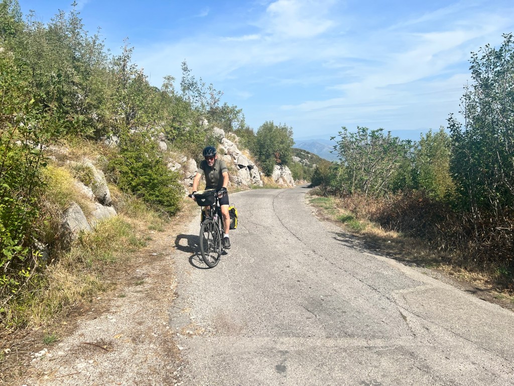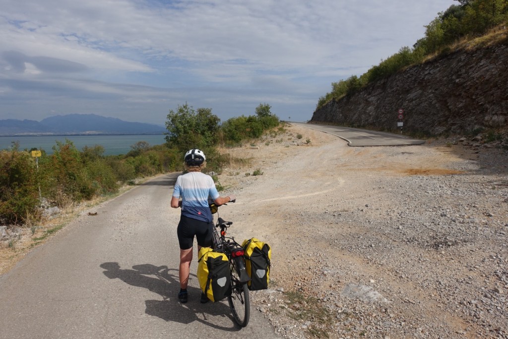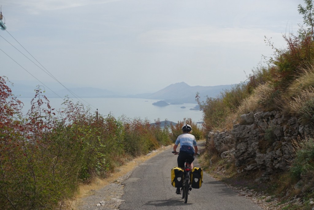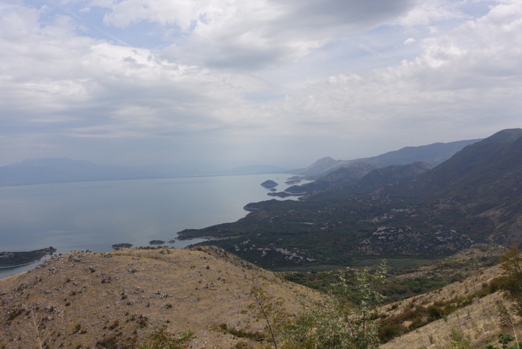 Dat het vandaag een zware etappe zou kunnen worden, wisten we wel. Na het vertrek uit Gudinje gaat het eventjes bergaf maar dan begint het klimmen. Door een woest gebied, tot hoog boven het meer van Shkodër, dat we de rest van de dag links diep beneden ons zien. De weg loopt tegen de flanken van de bergen en stijgt alsmaar door, soms erg pittig. We zijn al snel drijfnat van het zweet. De omgeving maakt wel veel goed, het is allemaal weer prachtig wat we om ons heen zien.