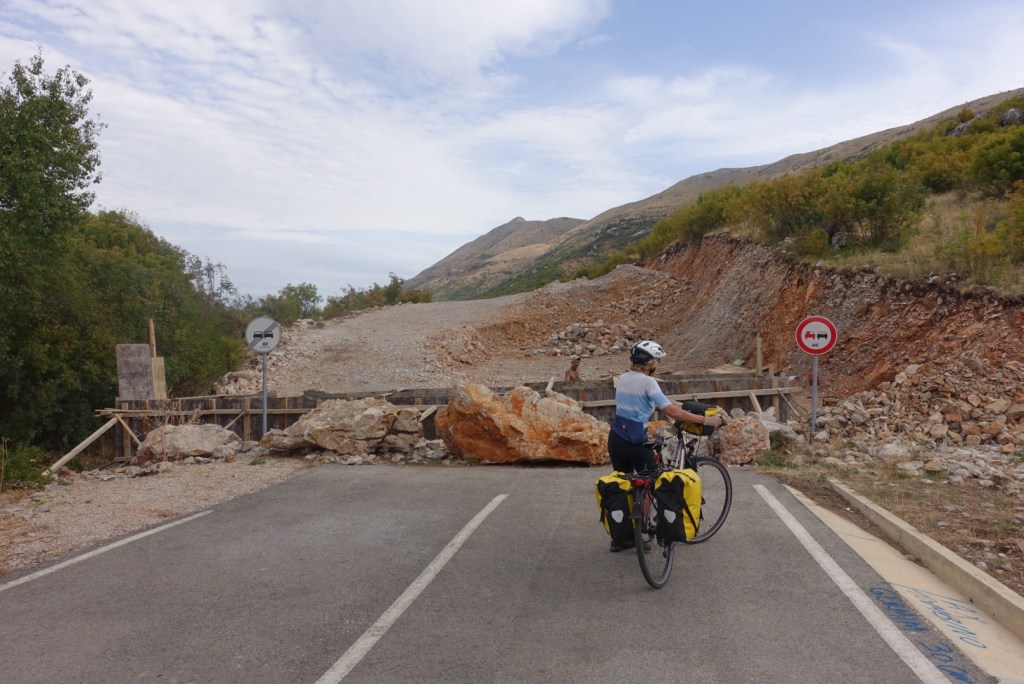Aan de Albanese kant is de weg nog verre van klaar. Je kunt er wel min of meer op fietsen.