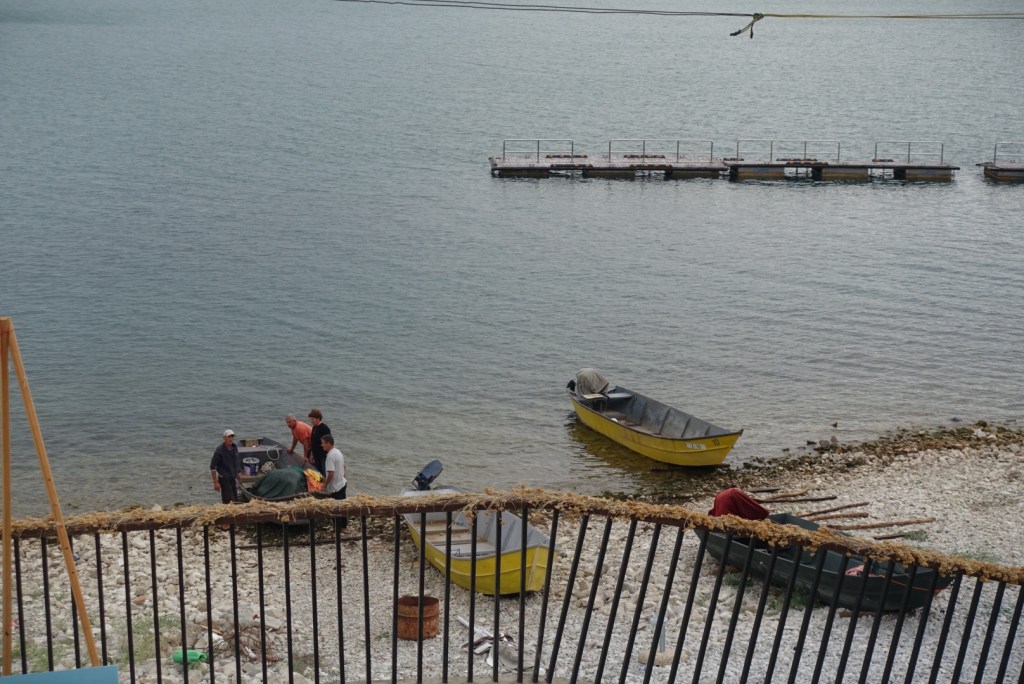 Het eerste dorp in Albanië is Žogaj. Daar nemen we een hotelkamer aan het meer, voor twee nachten. De vissers trekken hun bootjes wat verder het land op: er komt slecht weer aan.