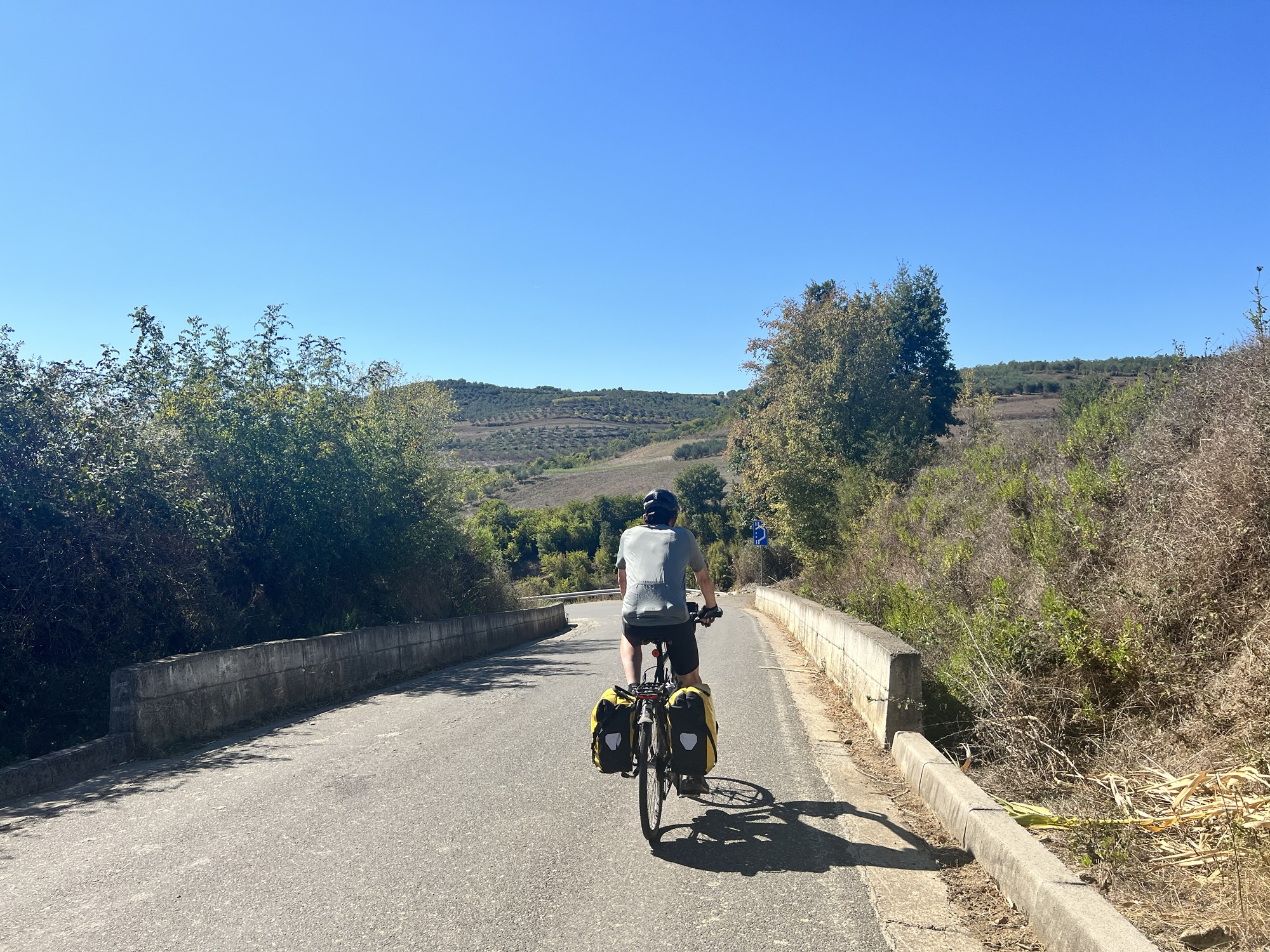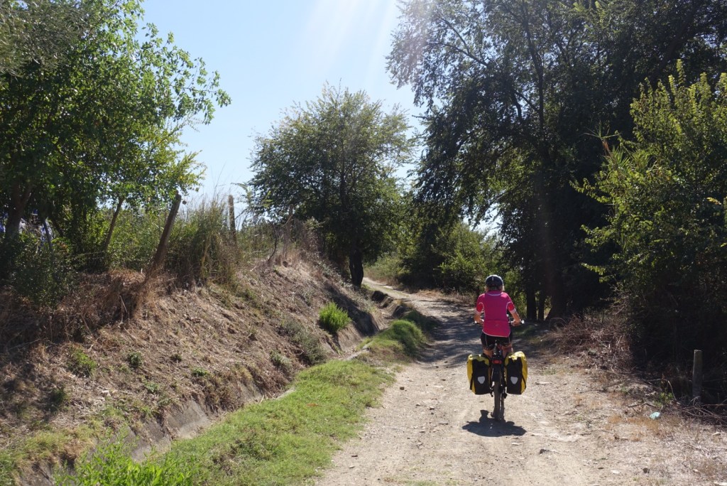 Dan krijgen we een type traject dat we intussen wel kennen van deze route: kleine weggetjes, al snel uitlopend op een pad dat soms met puin verhard is. Terwijl op korte afstand een vrij rustige verkeersweg loopt. We verlaten het pad snel, vandaag zullen we voor verbindingswegen kiezen zolang die rustig zijn.