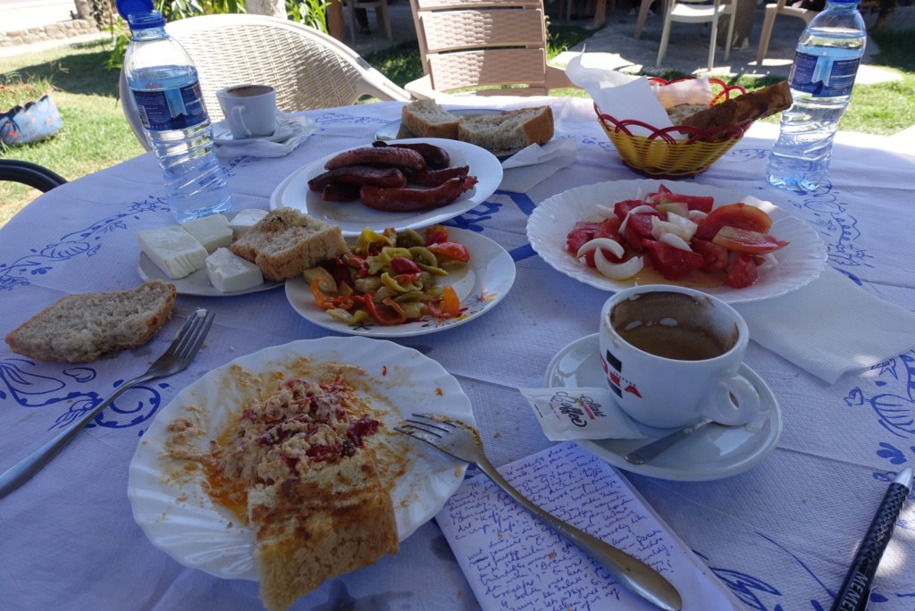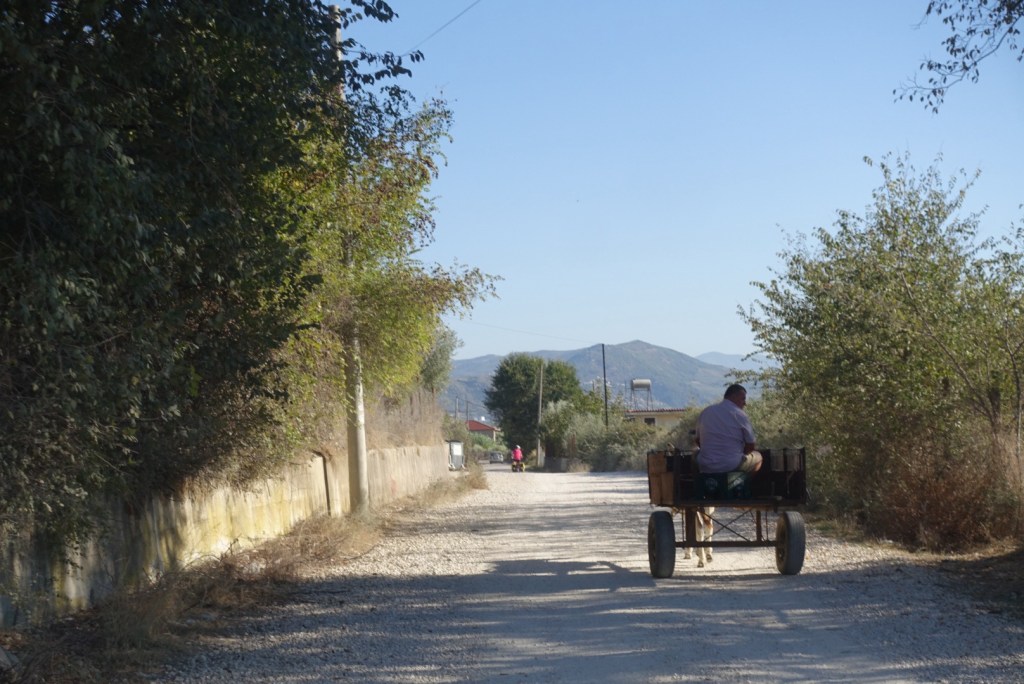 Halverwege Berat komen we door het dorp Girkan. Tijd voor de lunch. We hebben zelf brood bij ons en zien een geïmproviseerd ‘kafe’ bij een boerenwoning, met schaduwzitjes in de tuin. Daar mogen we vast wel ons brood eten bij koffie of fris. Maar als we toch even naar eten vragen, komt de boerin de ene na de andere schotel brengen. Het is veel te veel. We moeten uitkijken, zeggen we, anders komen we straks niet meer vooruit.