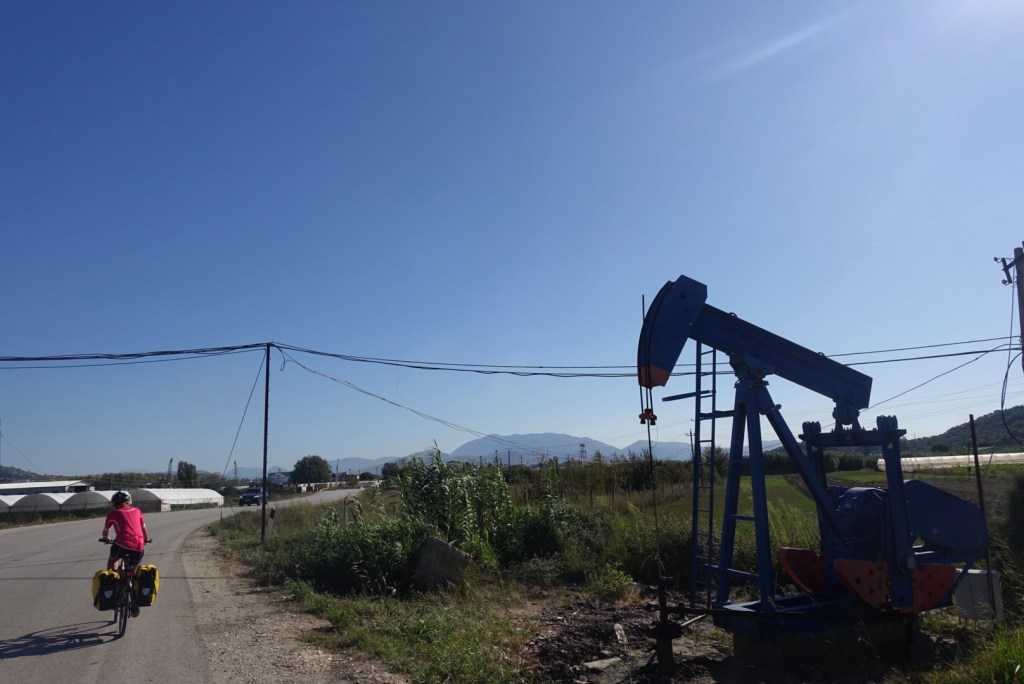 Het laatste deel van de etappe is nog heel bijzonder. Eerst door een voormalig aardolie-wingebied dat vol staat met oude ja-knikkers en boortorens. Je ruikt de olie overal. Het gebied is ook nog eens dicht bevolkt. Waar leven die mensen nu van?