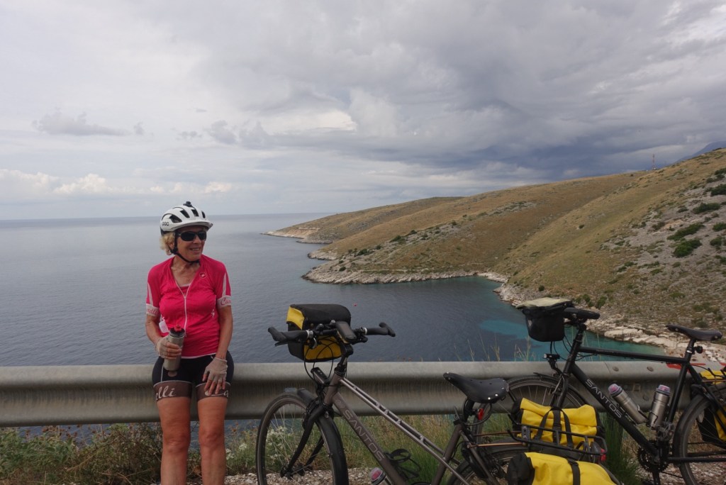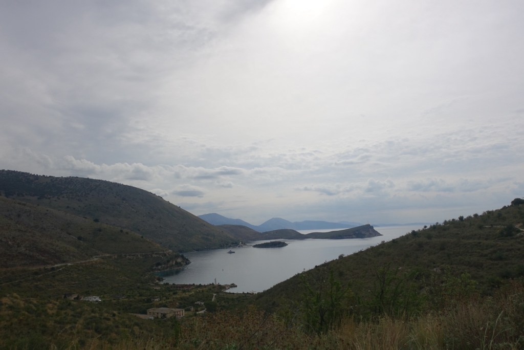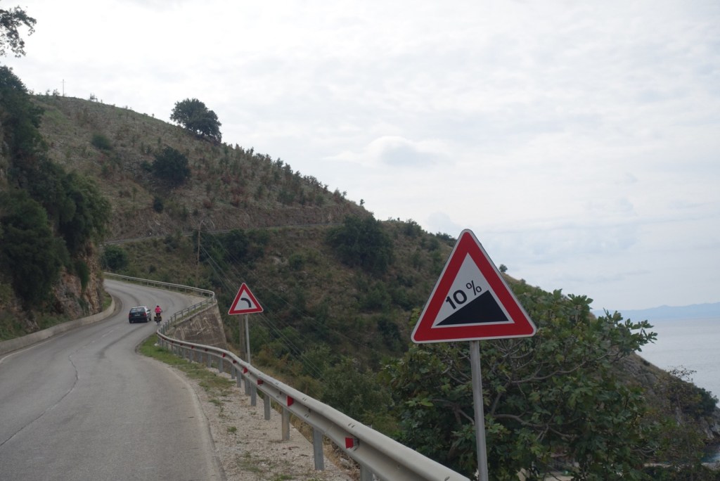 De kustweg vanaf Himara naar het zuiden is zonder meer prachtig. Soms fiets je hoog boven het water met mooie vergezichten, dan weer vlak langs zee. Betekent wel dat het voortdurend op en neer gaat: na elke zoevende afdaling volgt weer een, vaak lange en soms steile, beklimming.