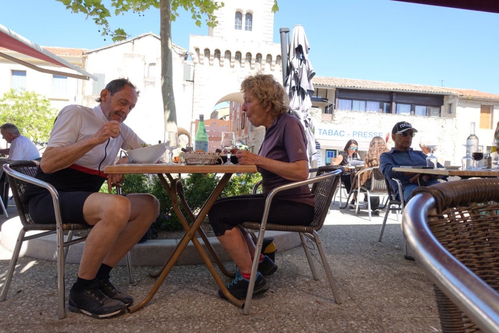 Om 12 uur zijn we in Le Thor. Tegenover de Tour de l’horloge zien we een wel zeer aantrekkelijk terras. Tijd voor een heerlijke maaltijdsalade. Van daar is het nog ruim 40 km naar Apt, maar de laatste 25 km gaan over een voormalig spoorlijntje dus dat is gemakkelijk fietsen.