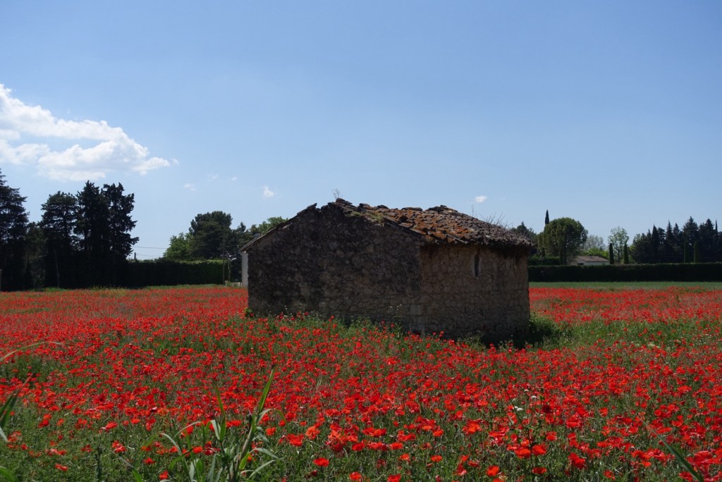 Overal klaprozenvelden en ook de meidoorn staat vol in bloei. Alleen de lavendel begint pas aarzelend groen te worden. De paarse kleur is voor later, in de zomer.