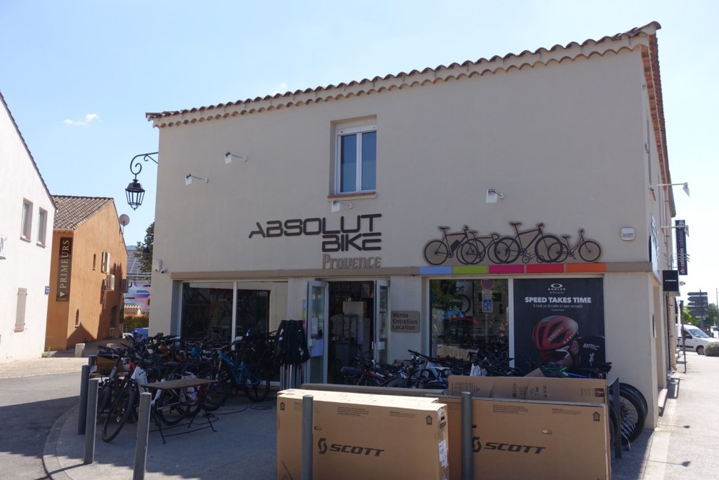 Als we het fietspad opdraaien voorbij Rubion zien we een fietsenmaker. Joos z’n versnellingen staan niet helemaal goed afgesteld en hier wordt dat gratis en in no time hersteld.