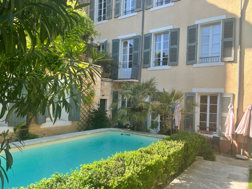 10 km voor Apt rijden we over de Pont Julien: een Romeinse brug van 3 v.Ch. Indrukwekkend. In Apt zelf is het even zoeken naar ons onderkomen Le Convent, in een voormalig klooster. We zijn hier eerder geweest en herinneren ons de prachtige binnentuin met zwembad. En die is er nog.